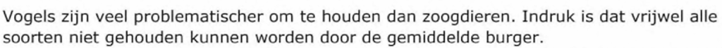 “Indruk is dat….” indruk? Het gaat niet om indrukken van onderzoekers, ambtenaren en hun persoonlijke mening. Het gaat om feiten, de praktijk en wetenschap. Waaruit blijkt dan dat vogels zoveel problematischer zijn om te houden? Of was er wellicht helemaal niet zoveel aan de hand bij de zoogdieren en is die lijst dus eigenlijk ook een beetje flauwekul?  Het is onacceptabel dat op deze manier de voorzetjes worden gegeven voor het invullen van een positieflijst. Dit zal iedereen met dit soort huisdieren raken, en het zal een hele sector omver duwen. Het is tijd om in te zien hoe kritisch, maar ook hoe bizar dit soort wetten tot stand komen.