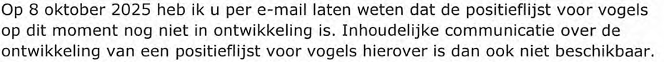2 september 2025 hebben wij een WOO verzoek gedaan om informatie te krijgen over de ontwikkeling, besluitvorming, en communicatie met betrekking tot de positieflijst voor vogels.